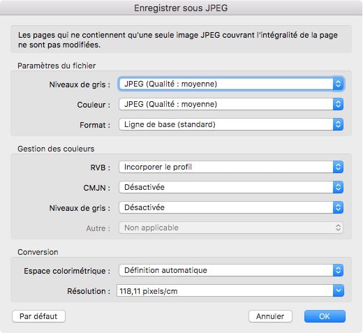 Dans la section Conversion, vous choisissez l’espace couleurs (Niveaux de gris, RVB…) et la résolution. À noter : ici la résolution s’exprime en pixels par centimètre , pensez à convertir : 59,06 px/cm équivaut à 150 dpi, 118,11 px/cm pour 300 dpi.