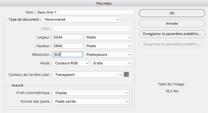 Conseil : pensez à régler la résolution dans Photoshop au moment de créer le nouveau fichier, sinon le logiciel reviendra à ses paramètres par défaut (72 ppp).
