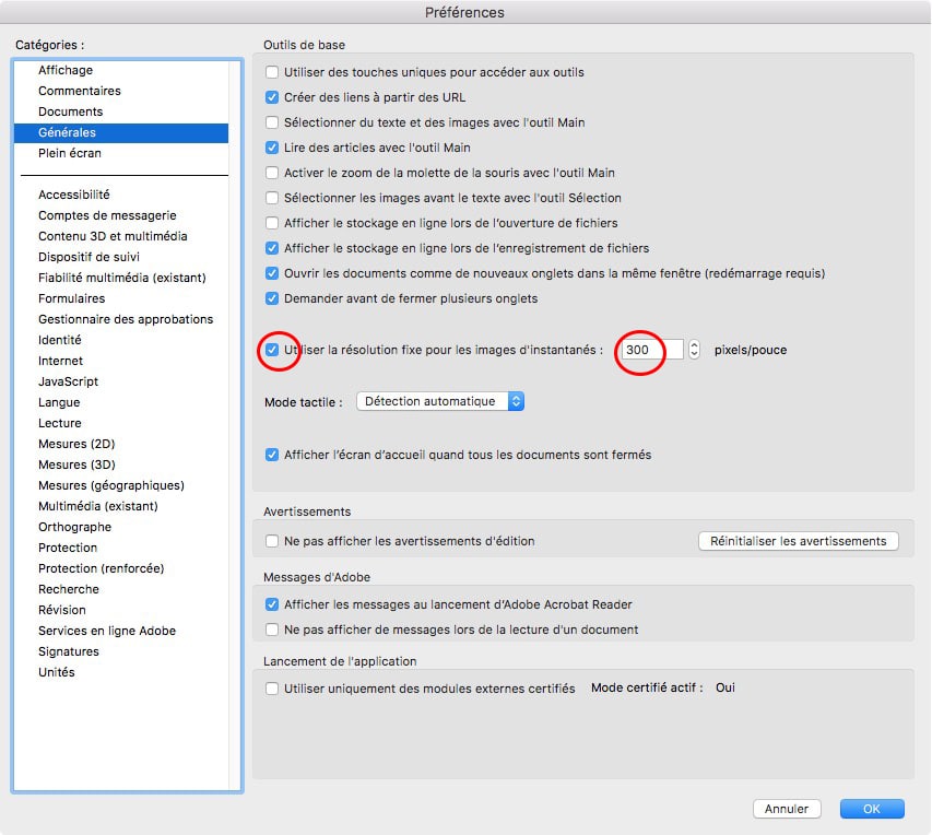Si la qualité par défaut ne suffit pas, rendez-vous dans les paramètres d’Adobe Reader, section Général, et activez la résolution fixe pour les captures. Vous pourrez alors définir, par exemple, 300 ppp pour une image vraiment nette.