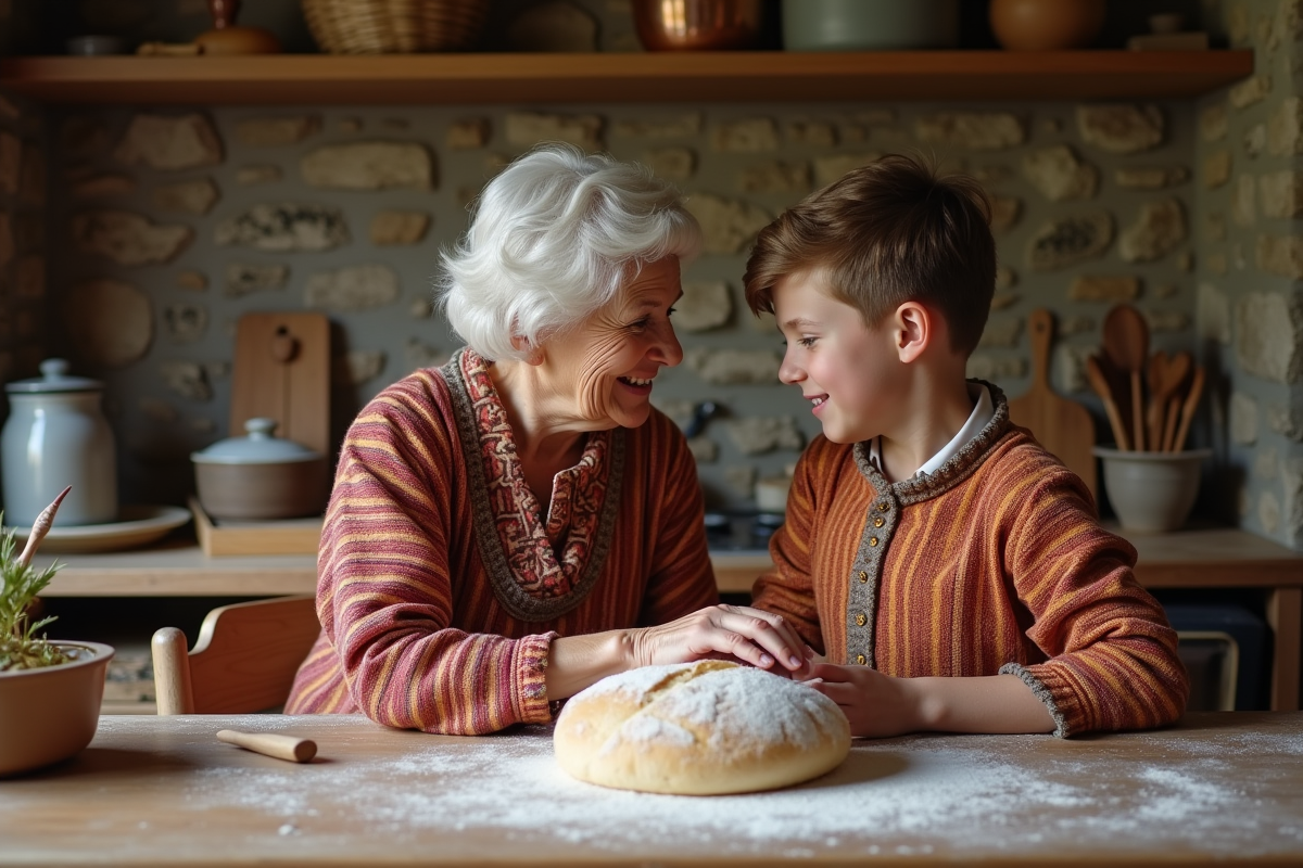 Femme âgée et enfant en costumes traditionnels français préparant du pain